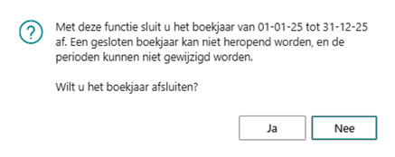 - Er verschijnt een melding waar aangegeven wordt welk boekjaar er afgesloten wordt. Klik op Ja om te bevestigen.