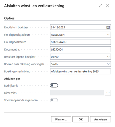 - Geef een duidelijke boekingsomschrijving. Bijvoorbeeld Afsluiten Winst- en verliesrekening 2025.