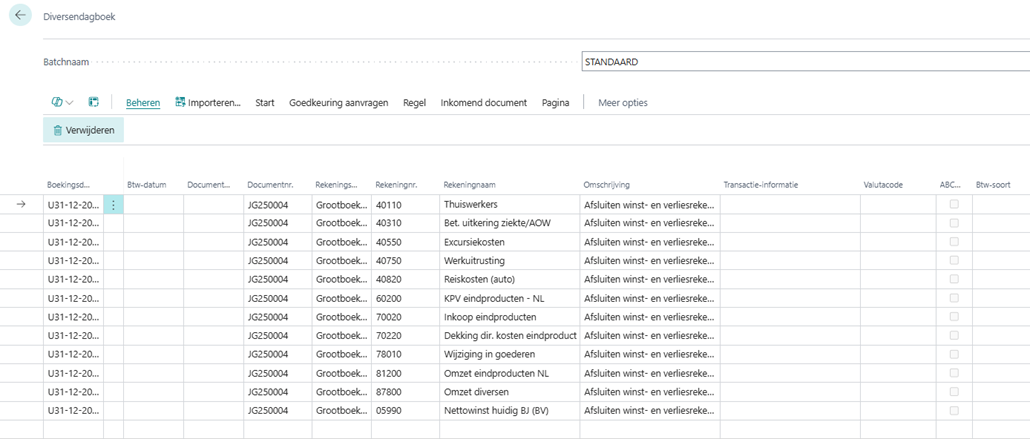 De batchverwerking geeft de einddatum van het af te sluiten boekjaar aan: In dit voorbeeld is dit 31- 12-2025. Na het boeken van alle bijbehorende posten zal deze datum terug te vinden zijn in de journaalposten. De zogenaamde Ultimoposten. Je kan deze posten herkennen doordat er een U voor de datum staat: “U31-12-2025”.