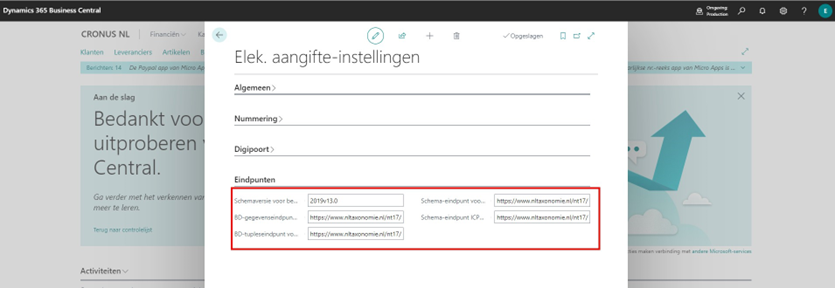 Ga in Business Central met behulp van de zoekfunctie naar “Elek. Aangifte-instellingen”. Op deze pagina worden de URL’s (ook wel eindpunten) voor de aangiften ingesteld.