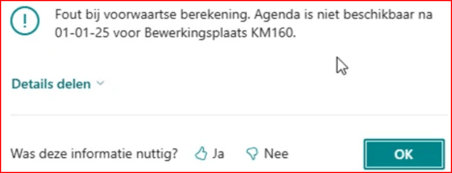 U krijgt een onderstaande melding als de productie agenda’s niet zijn aangemaakt. Dit gebeurd tijdens het aanmaken van de productieorders.