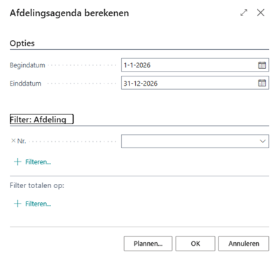 - Eventueel een specifieke afdeling. Als in het veld Nr. onder het tabblad Filter: Afdeling geen waarde ingevuld wordt, wordt de agenda berekend voor alle afdelingen.