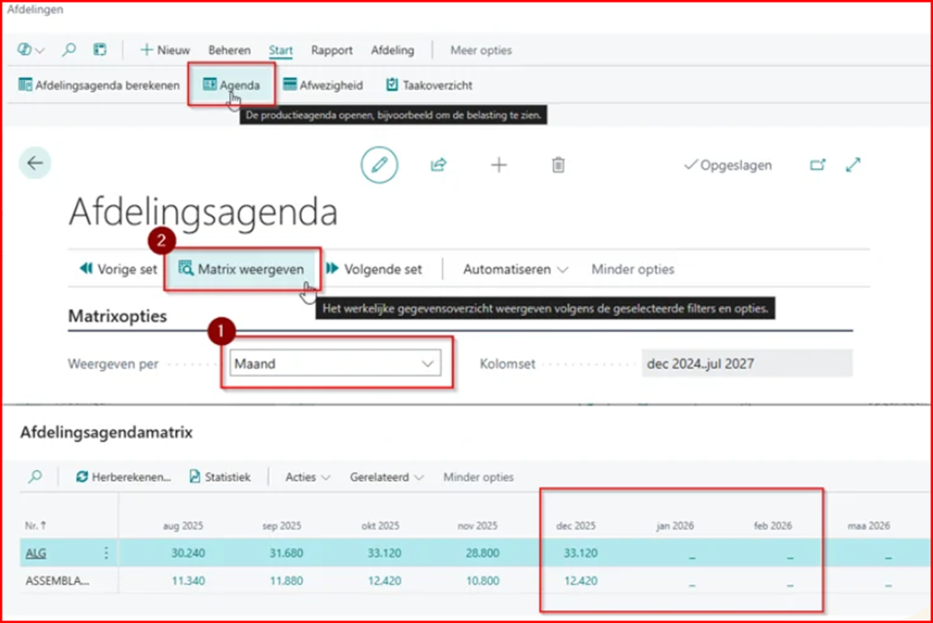Open hiervoor de pagina afdelingen in Business Central. Kies op de pagina afdelingen voor Start -> Afdelingsagenda berekenen.