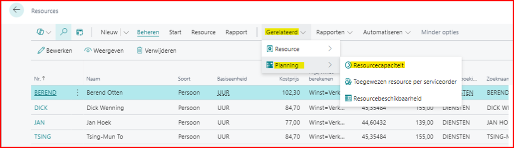 Ga hiervoor naar de pagina Resources. Kies in het lint van de resources voor Gerelateerd -> Planning -> Resourcecapaciteit.