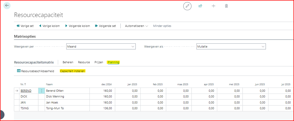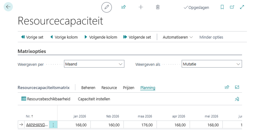 Selecteer in het volgend scherm vervolgens de Resource en kies in het lint voor Planning -> Capaciteit instellen.
