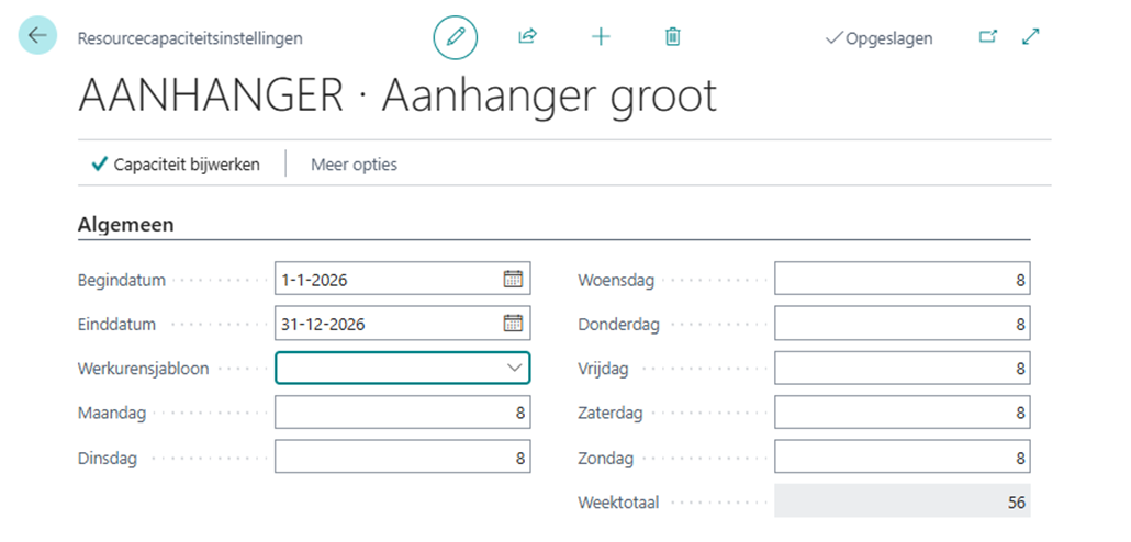 Kies vervolgens voor Capaciteit bijwerken. Hiermee is de capaciteit voor deze resource berekend voor het komend jaar.